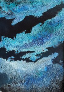 Die gezeigten Werke sind Mixed-Media-Arbeiten auf Leinwand und Holz. Durch die Verwendung von Sand, Pigmenten, Kohle und Acryl entstehen strukturierte Meereslandschaften, die zwischen Weite und Ruhe, Bewegung und Rückzug angesiedelt sind. Die Werke erzählen vom Unterwegssein und Ankommen, vom Salz in der Luft und dem Gefühl von Heimat; dort wo Wellen fließen und Erinnerungen entstehen.